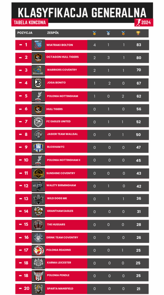 Zwycięstwo po rzutach karnych z Wiatraki Bolton (1:1 w regulaminowym czasie). Silna gra i zimna krew w najważniejszych momentach.2. miejsce – Wiatraki Bolton