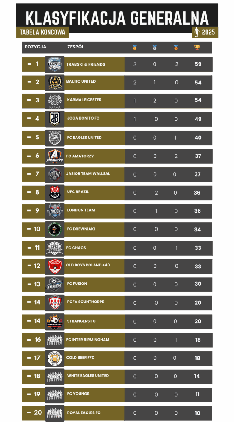 Strona główna Over 35 – Sezon 2025 Over 35 – Sezon 2025 Sezon 2023 Sezon 2024 Sezon 2025 Sezon 2026 Nasze relacje Aktualności, OVER_2025, OVER_2025, RozgrywkiOVER 35 | Etap 7 – Baltic United kończą sezon z przytupem!Aktualności, OVER_2025, OVER_2025, RozgrywkiOVER 35 | Etap 6 – Trabski & Friends po złoto, Chaos FC z brązem!Aktualności, OVER_2025, OVER_2025, RozgrywkiOVER 35 | Etap 5 – Karma Leicester z pierwszym złotem w sezonie!